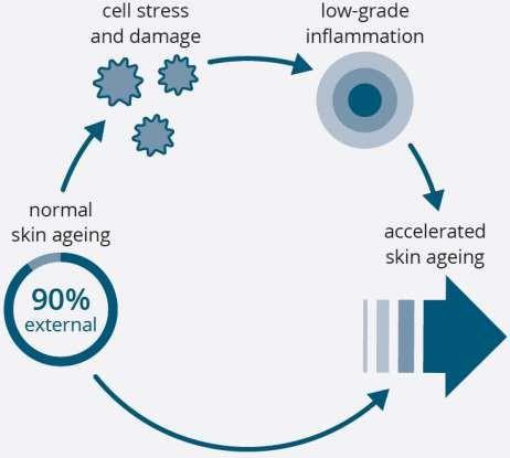 Izraz "upala" odnosi se na kontinuirani upalni proces niskog nivoa i asimptomatski je povezan sa starenjem. Ovaj proces je posebno potaknut izlaganjem UV zracima, koje indukuju oksidativni stres i proizvodnju proupalnih citokina. Takav upalni odgovor s vremenom može postati hroničan i postupno uzrokovati oštećenje tkiva kože kao što su: • Inhibicija mehanizama popravka • Dehidracija • Slabljenje matriksa kože • Degradacija kolagena i elastina • Oštećenje kožne barijere • Solarni lentigo